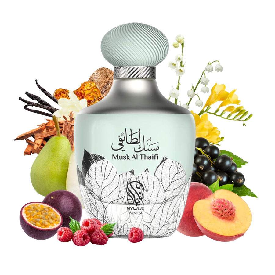 Nylaa Premium Almizcle Al Thaifi celebra el almizcle de Taif con rosas de la ciudad sagrada y especias árabes en la apertura. El corazón intensifica el almizcle real con flores orientales, mientras la base de maderas nobles y ámbar crea una fragancia unisex de lujo espiritual y tradición saudí.